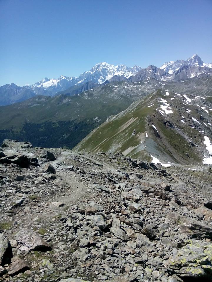 Dal col vertosan il sentiro di discesa verso Tsa de Flassin . Sullo sfondo il gruppo del bianco